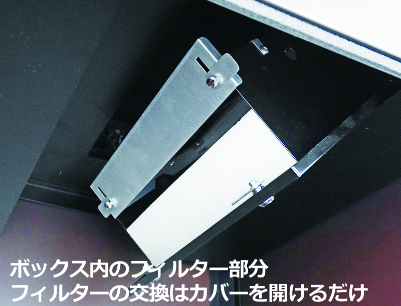 天井部のファンと脱臭フィルター・消臭フィルターの組み合わせで排煙設備が不要な一人用の分煙ボックスです。